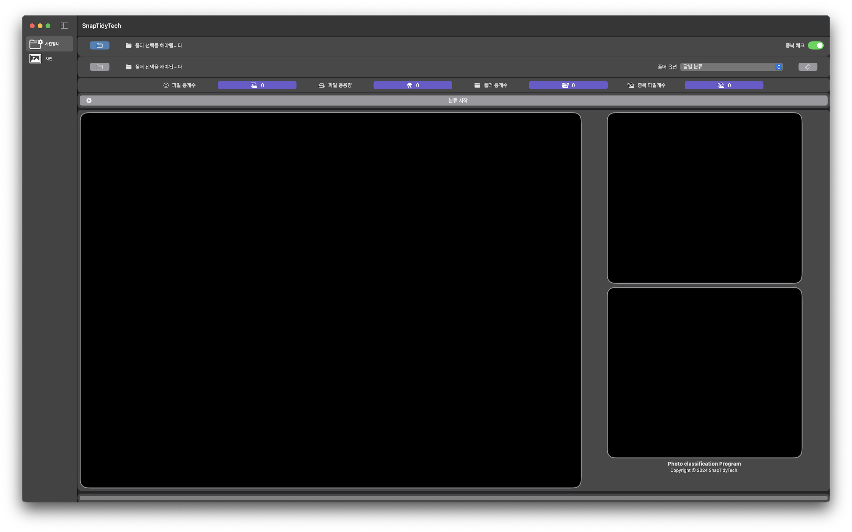 SnapTidy의 사이드 네비게이터는 사진 정리함과 사진이라는 두 가지 주요 탭으로 구성되어 있습니다.